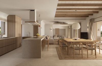 - Open-plan leefruimte met kookeiland, afgewerkt met houten balken en natuurlijke pleister voor een kalme, comfortabele setting