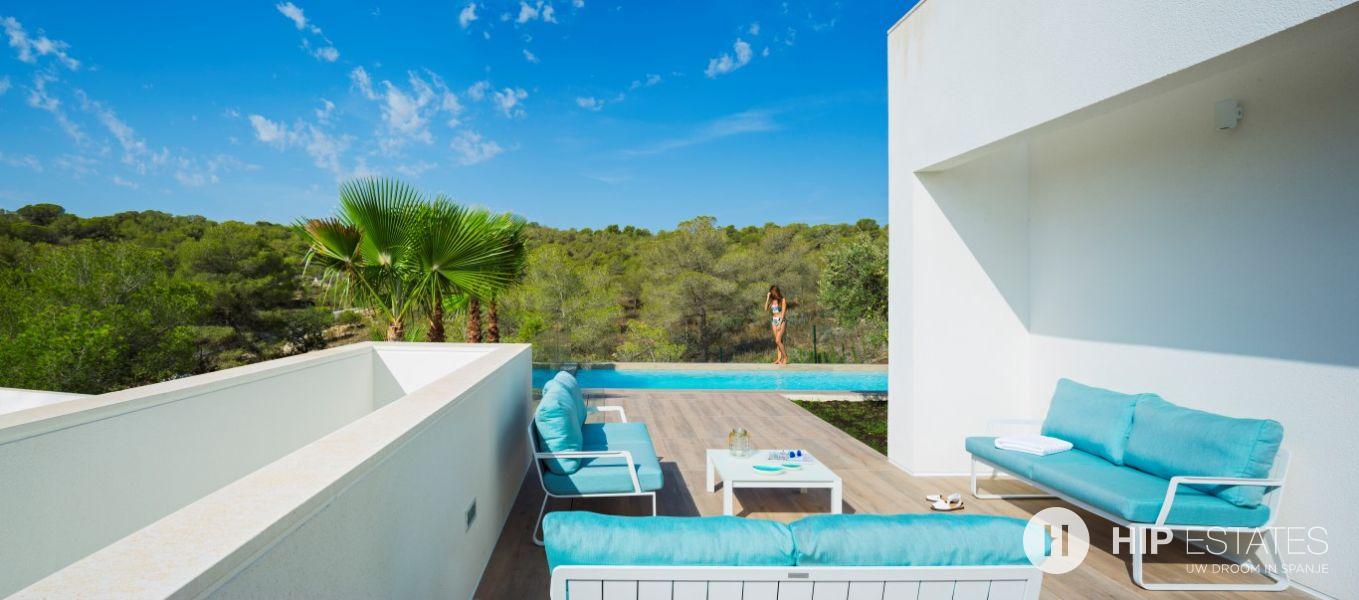 U komt binnen in de ruime hal, die uitwijkt in het leefgedeelte langs de ene kant en de slaapkamers langs de andere kant. De leefruimte beschikt over een eet- en zitgedeelte en de open keuken. De master bedroom heeft z'n eigen badkamer en dressing, de overige twee slaapkamers hebben een gemeenschappelijke badkamer. Op de bovenverdieping bevindt zich het riante solarium, waar u kan genieten van de zon met een hapje en drankje, of gewoon een goed boek.
