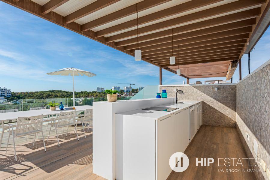 De buitenkeuken komt compleet met twee koelkasten, kookplaat, vaatwasser en kasten. De pergola op het dakterras kan worden afgesloten voor uw privacy en comfort