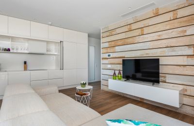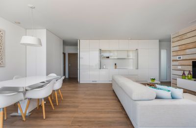 Modern ingerichte penthouse op een hoek met een ruime woon- en eetkamer en open keuken.