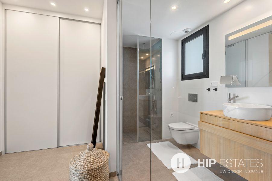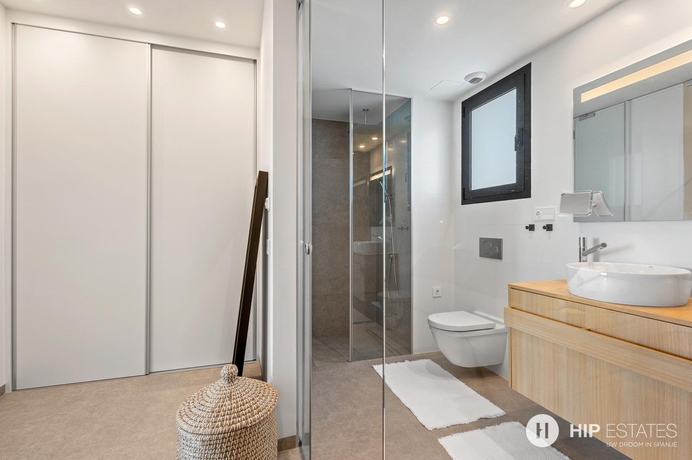 Een van de absolute troeven van deze woning is het indrukwekkende dakterras van maar liefst 58 m². Hier geniet u van volledige privacy en zon gedurende de hele dag. Het dakterras is uitgerust met een buitendouche, een buitenkeuken en een pergola met zonneluifel. Daarnaast is er voldoende ruimte voor een grote eettafel voor acht personen en een gezellige loungehoek, ideaal om te ontspannen of gasten te ontvangen.