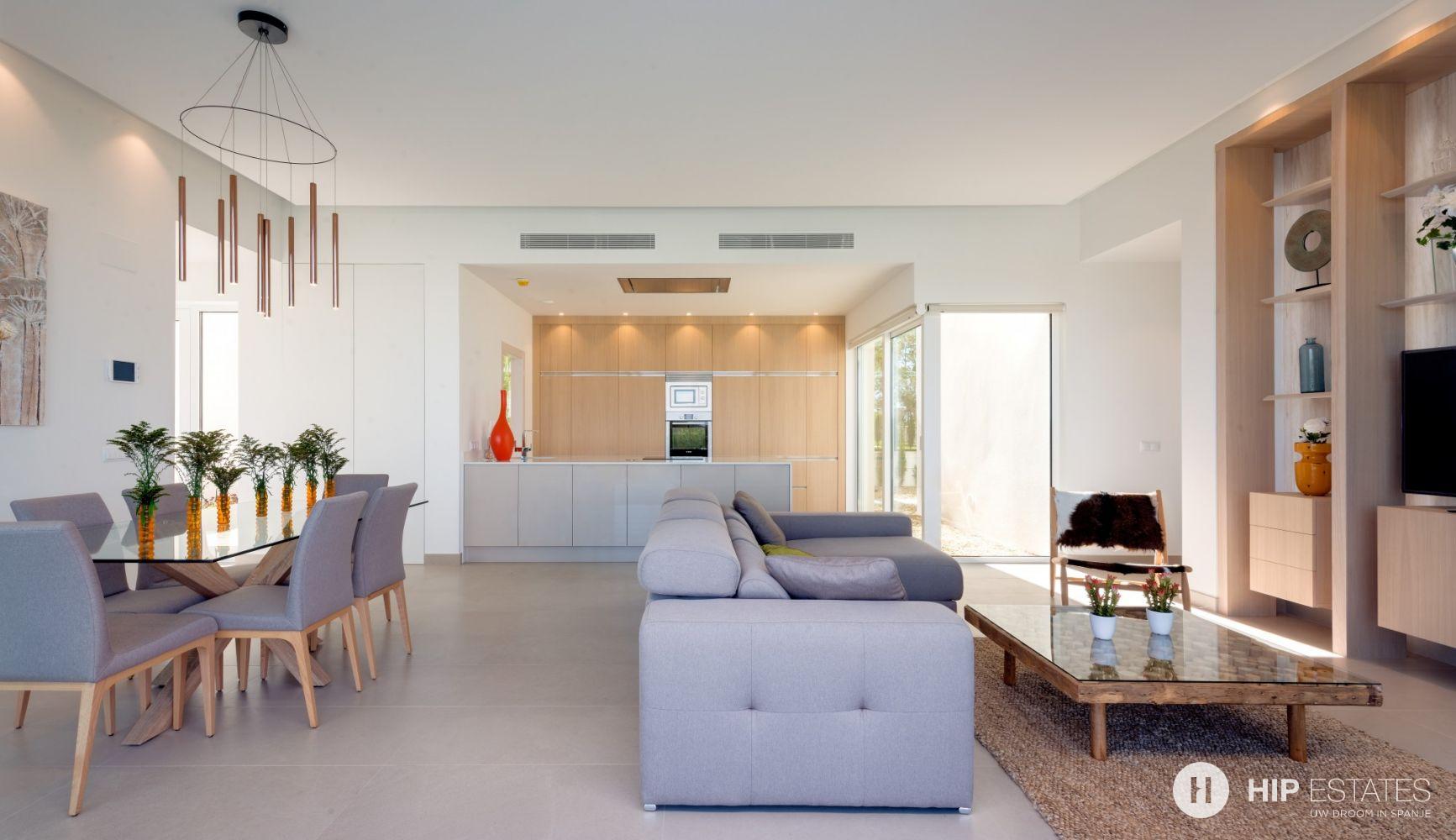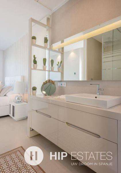 U komt binnen in de ruime hal, die uitwijkt in het leefgedeelte langs de ene kant en de slaapkamers langs de andere kant. De leefruimte beschikt over een eet- en zitgedeelte en de open keuken. De master bedroom heeft z'n eigen badkamer en dressing, de overige twee slaapkamers hebben een gemeenschappelijke badkamer. Op de bovenverdieping bevindt zich het riante solarium, waar u kan genieten van de zon met een hapje en drankje, of gewoon een goed boek.