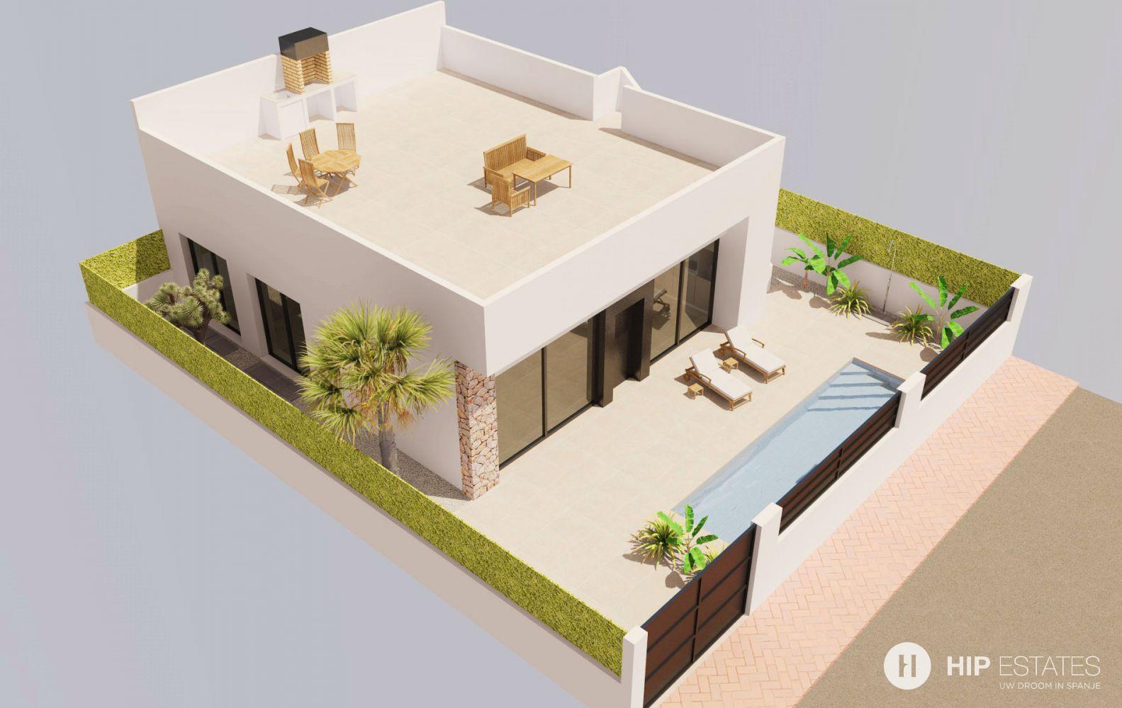 De villa's zijn volledig op 1 niveau gelegen en beschikken over een mooi aangelegde tuin met privaat zwembad, berging en ruim terras. Binnen vindt men 2 of 3 slaapkamers, 2 badkamers (waarvan 1 en-suite) en een ruime woonkamer met open keuken van waaruit u rechtstreekse toegang heeft tot het terras. Over de ganse woning is nog een groot dakterras voorzien.