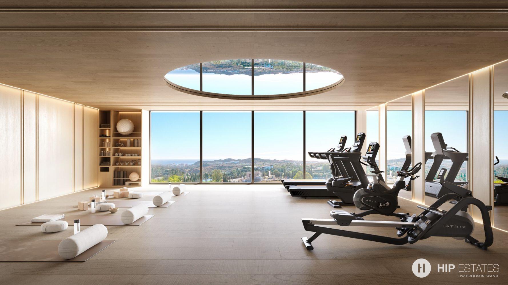 De fraai aangelegde gemeenschappelijke zones omvatten een infinity-zwembad, een volledig uitgeruste fitnessruimte en rustige wandelpaden omgeven door groen. Alles is ontworpen om te ontspannen, met de zee steeds als decor.