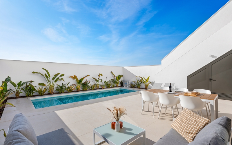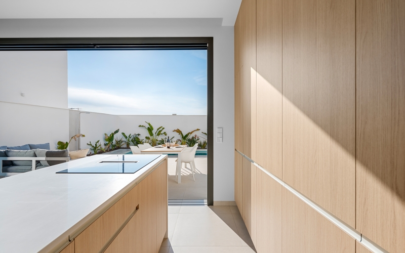Hoewel de Costa Cálida letterlijk ‘warme kust’ betekent, was de voorbije winter natter dan normaal. “Maar nu schijnt de zon onafgebroken en zitten we elke dag buiten. Ons terras is volledig afgesloten en daardoor bijna windvrij – ideaal in de winter. In de zomer trekken we naar het dakterras van 125 m², waar het zeebriesje voor verkoeling zorgt. We plannen daar nog een overkapping, een buitenkeuken en zonnepanelen voor de zwembadverwarming.”