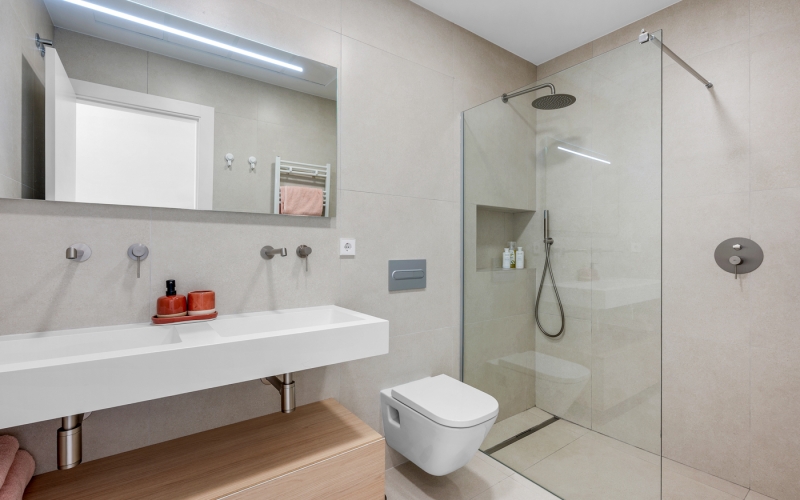 “Als schrijnwerker let ik automatisch op afwerking,” zegt Walter. “De gebruikte sloten zijn van topkwaliteit, en dat verraste me aangenaam. Ook praktische details zoals nisjes in de douche, ingebouwde verlichting en perfect uitgelijnde plinten tonen hoe goed dit is uitgedacht. Geen opstaande randjes waar stof zich ophoopt – dat zijn zaken die je pas waardeert als je ze ziet.”
